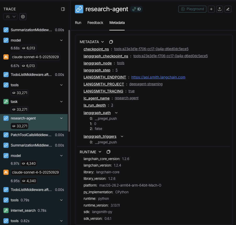 在这种情况下,名为 "research-agent" 的子智能体将在任何相关的智能体运行元数据中具有 {'lc_agent_name': 'research-agent'}: